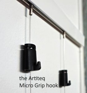 This will be easily achieved by using one of the Artiteq Hooks: they have a manual or automatic grip device that lock them in position and enable them to hold up to 20Kg of weight. You can simply disengage the grip by pressing a button on the top allowing you to slide the hook along the wire and adjust it to the desired height. Release the button and the automatic grip will come into action again, firmly holding the hook and whatever is attached to it in its new position.