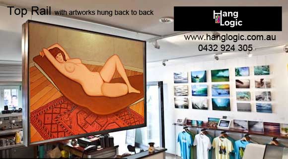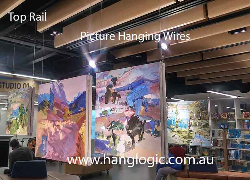 This is a picture hanging system designed for horizontal surfaces that allows your paintings to hang down from the ceiling or from a beam.